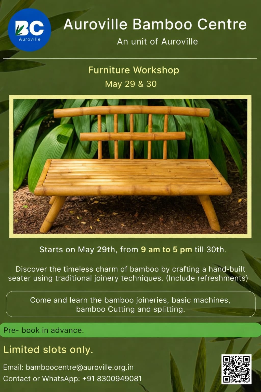 Discover the timeless charm of bamboo by crafting a hand-built seater using traditional joinery techniques. (Include refreshments)